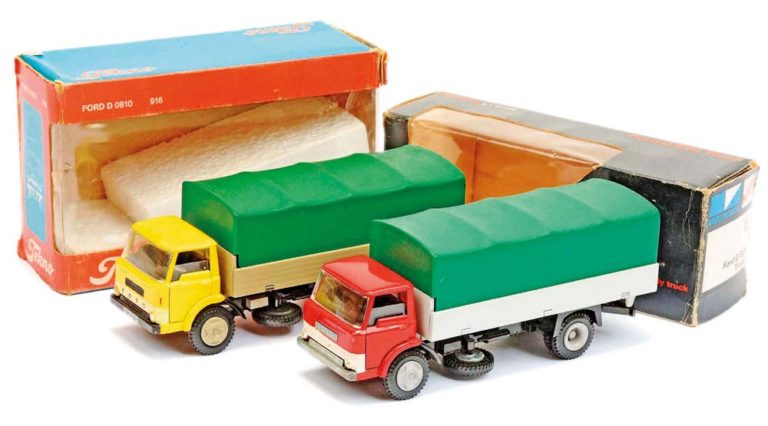 Le plateau à ridelles bâché et le grumier. Même si elles sont encore nombreuses, les variantes des Ford 800 de Tekno diminuent avec les nouvelles versions du modèle, deux camions…